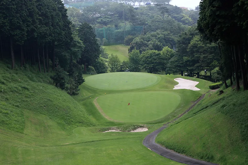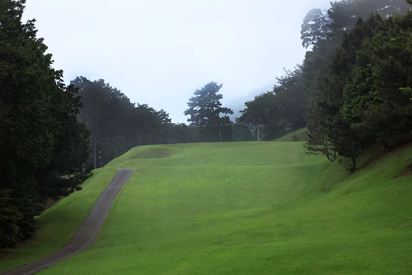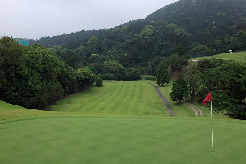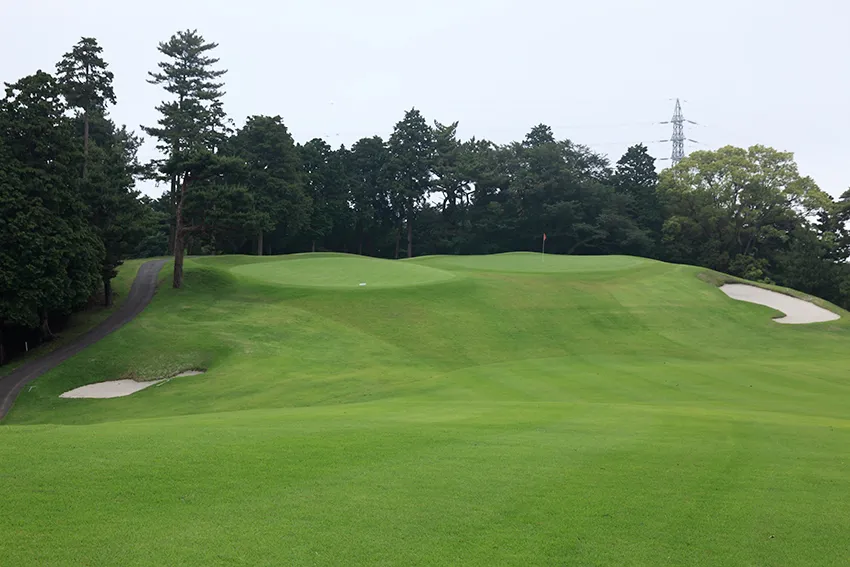 • 豪快な打ち下ろしのロングホール。一打目落下地点のフェアウェイが右下がりに傾斜しているため、狙い目は左サイド。二打目は左サイドのOBラインが浅いので、無理をせず100ヤード残しで平らなライの広がる欅の大木の右サイド狙い。グリーンは比較的大きめなので、しっかり乗せて確実にパー狙い。