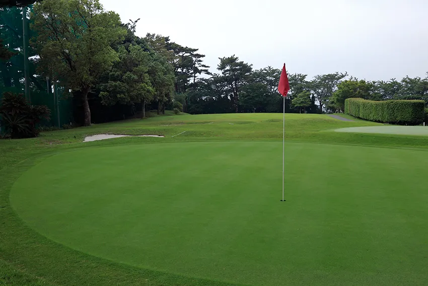 • 池越えのミドルホール。右サイドのネットを越えると美術館の駐車場に打ち込むため、200ヤード以内のクラブを選択してください。グリーン手前斜面にあるバンカーは狭い上に深いので、2打目のクラブ選択は重要です。グリーン奥には土手があるため、ボールは止まるが上からのアプローチは非常に難しいので、手前から寄せて行くと良い。