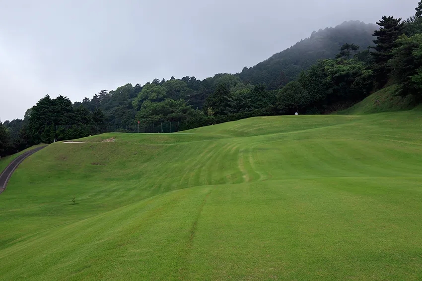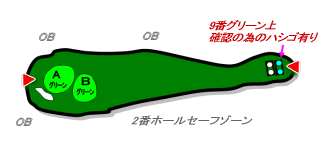 • 左右ともOBは無い。手前が谷になっているので、谷を越える所まではボールを運んでおきたい。フェアウェイ左サイドの窪地はカート道路までは問題ないので、思いきって攻められる。Aグリーンは左に向かって、傾斜して順目のため、落とし所はA・Bグリーンの間。グリーン奥からの返しは要注意。